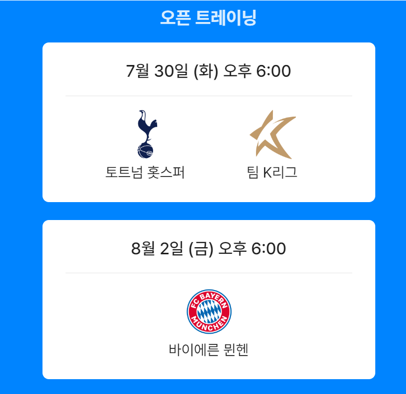 7월 30일 오후 6시 토트넘 오후 7시 30분에는 팀 K리그의 오픈트레이닝이 진행될 예정이다